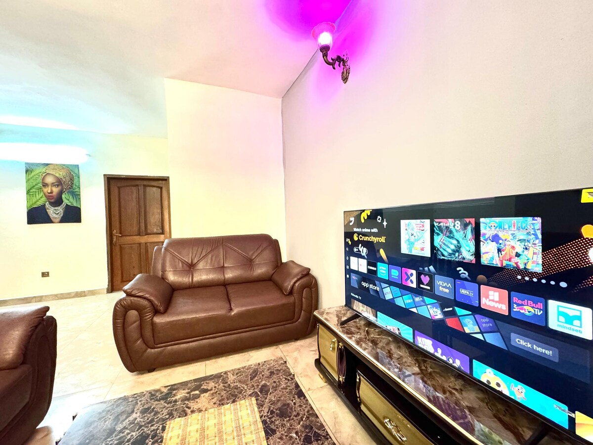 Árasán nua - aimseartha, glan agus ciúin (90 m2) le haghaidh do thréimhsí fanachta in Yaoundé. Tá an t - árasán suite in Ekoumdoum (in aice le Odza). Is í Bambinos School an t - ionad. Leathbhealach idir lár an bhaile (thart ar 15 nóiméad) agus an t - aerfort (thart ar 25 nóiméad) sa charr Rochtain éasca ar roinnt ollmhargaí amhail Santa Lucia, Carrefour (5 nóiméad) nó stáisiúin gháis de réir mar is gá (800 m) In aice leis an bpríomhbhóthar a fhágann go bhfuil sé éasca teacht air i gcarr nó ag siúl. Páirceáil, Wi - Fi Gan Teorainn, A/C, feighlí ar fáil