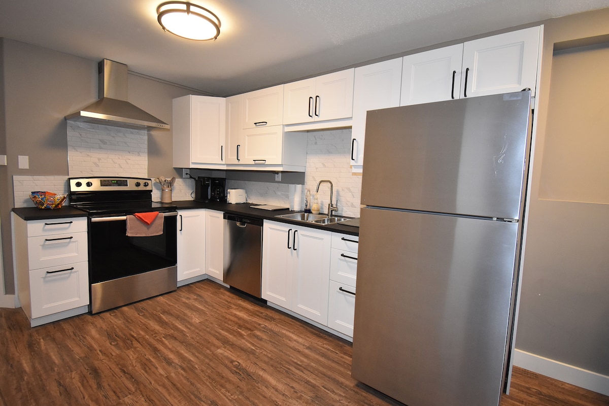 This stylish bungalow is perfect for a small group; it is your home away from home. Entire top floor of bungalow with over 1250 square foot of renovated space, 20 minutes away from Jasper national park and an hour to the town of Jasper. Essential services such as grocery, restaurants, etc. are about a three-minute drive. Fully stocked kitchen with everything you may need: Utensils, stove, fridge, dishwasher, coffee maker, Kettle, microwave, toaster, juicer, mixer, kitchenware, etc.