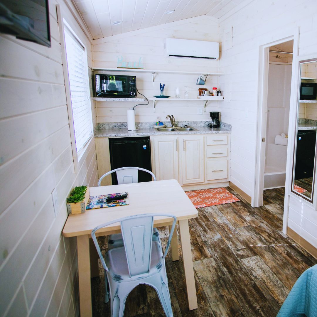Is cábán tí beag bídeach aon seomra leapa é seo ina bhfuil leaba bhanríona, cistin agus spás maireachtála agus bia. Tá 1 leaba cúr cuimhne ar mhéid na banríona sa chábán beag bídeach seo sa leagan amach álainn máistirshraith. Tá an áit itheacháin suite do bheirt agus tá tolg futon sa seomra suí. Tá gach rud a theastaíonn uait chun béile de dhéantús baile a dhéanamh sa chistin agus tá barr sorn ann. (gan oigheann). Tá teilifíseán cothromscáileáin sa spás maireachtála le Netflix comhlántach chun taitneamh a bhaint as.