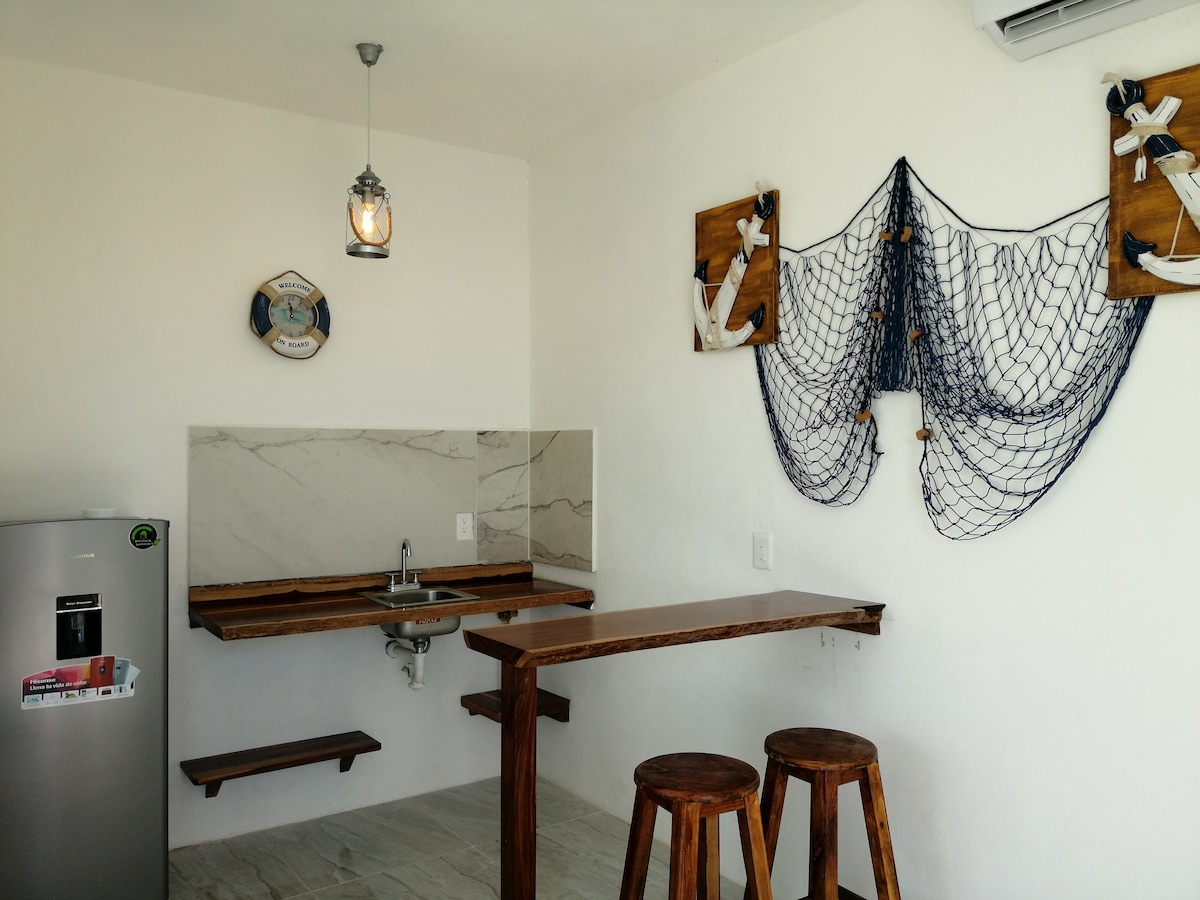 Is lóistín é a bhfuil rochtain aige ar an Laguna de Bacalar 10 méadar ar shiúl, níl T.V. againn Táimid 5.4 km ó lár Bacalar. Má tá comhartha fón póca agus Wi - Fi ann (is féidir teip). Tá seirbhís sheachtrach tacsaí ann ach tabhair feithicil leat. Tá cócaireán ann chun caife a dhéanamh, agus fuaraitheoir do na deochanna úra. Atá feistithe le leaba Kingsize, aerchóiriú, gaothrán agus seomra folctha féin. tá sé i 2do piso.