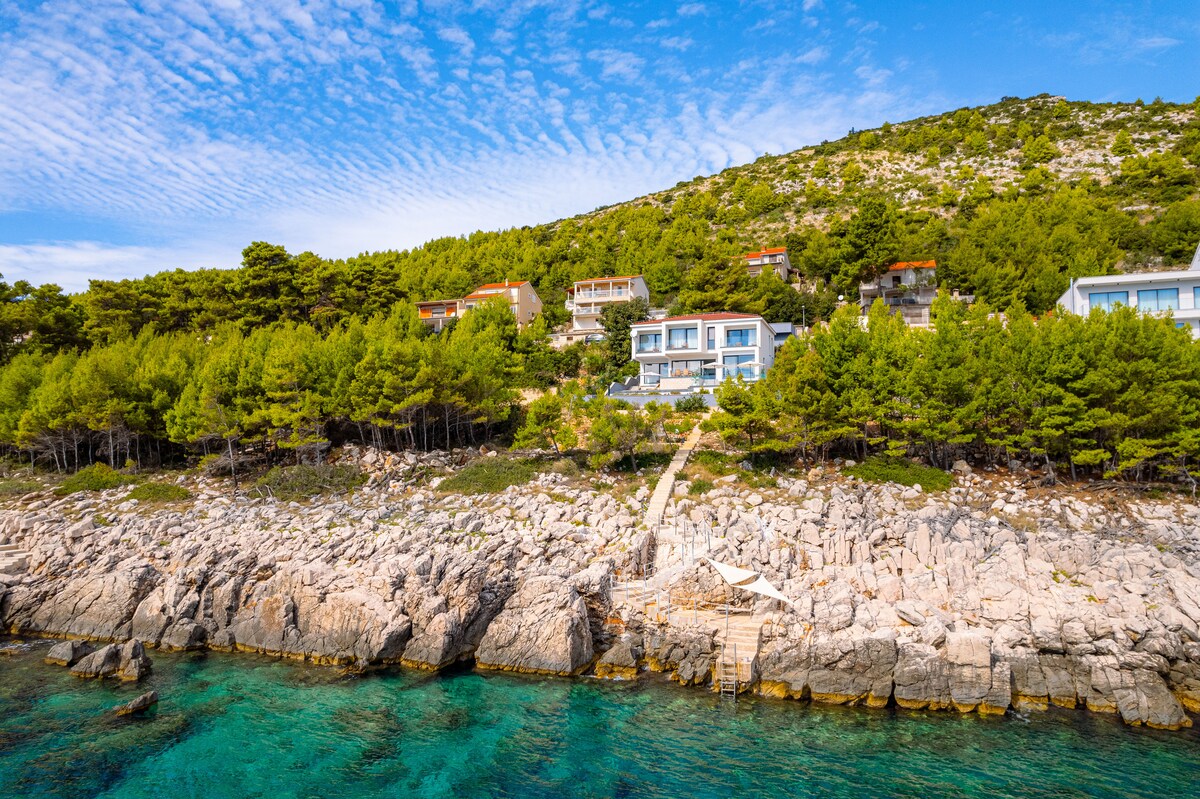 Fáilte go Pine Beach Villa Hvar – tearmann príobháideach só atá neadaithe díreach céimeanna ón Muir Aidriad. Timpeallaithe ag glaise méith agus uiscí atá soiléir ó thaobh criostail de, cuireann an villa eisiach seo atá tógtha i stíl thraidisiúnta Dalmatian, an lóistín cois trá deiridh in Hvar ar fáil, ag cur seclusion le chéile le suíomh den scoth agus radharc dodhearmadta.