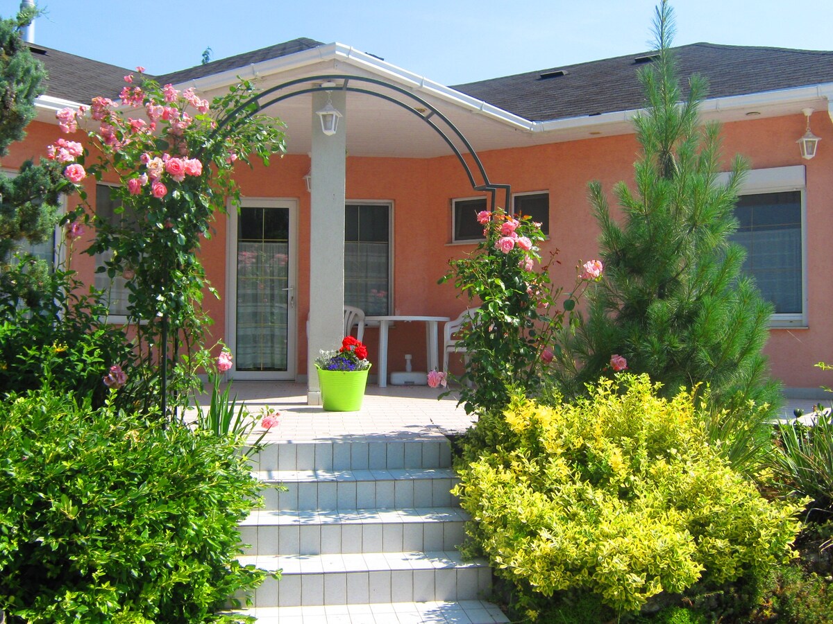 Suite i villa athchóirithe galánta atá suite i gceantar nádúrtha cois contae atá saor ó thorann. Áit shuaimhneach le fanacht don teaghlach nó do lánúineacha. Sa charr: Hévíz - 10 nóiméad, Balaton - 14 nóiméad agus Keszthely - 13 nóiméad. Gach rud a theastaíonn uait chun am suaimhneach a bheith agat le hardán bríomhar agus cistin sheachtrach chomhroinnte agus beárbaiciú. Bain sult as do chaife agus do luí gréine ar an dá bhalcóin ar leith atá ag breathnú amach ar gach taobh den villa. Breathnaigh ar an dúlra agus ar ainmhithe in aice láimhe le feirmeacha agus túr faire amach ar shiúlóid ghearr.
