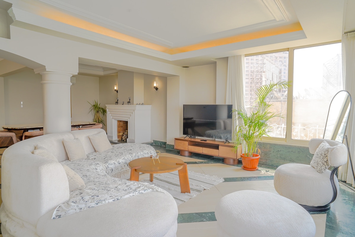 Stay in an iconic Nile-view apartment in the heart of Cairo. Enjoy panoramic views of the Nile River, Zamalek Island, and Downtown. Steps from Tahrir Square, the Egyptian Museum, and 5-star hotels like the Ritz-Carlton & St. Regis. Featured in films and ads, this stylish, secure apartment is perfect for creatives, couples, and business travelers. Walk to major landmarks, metro, dining & culture hotspots.