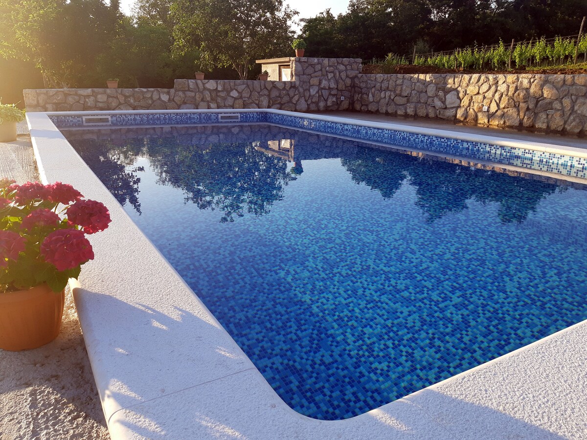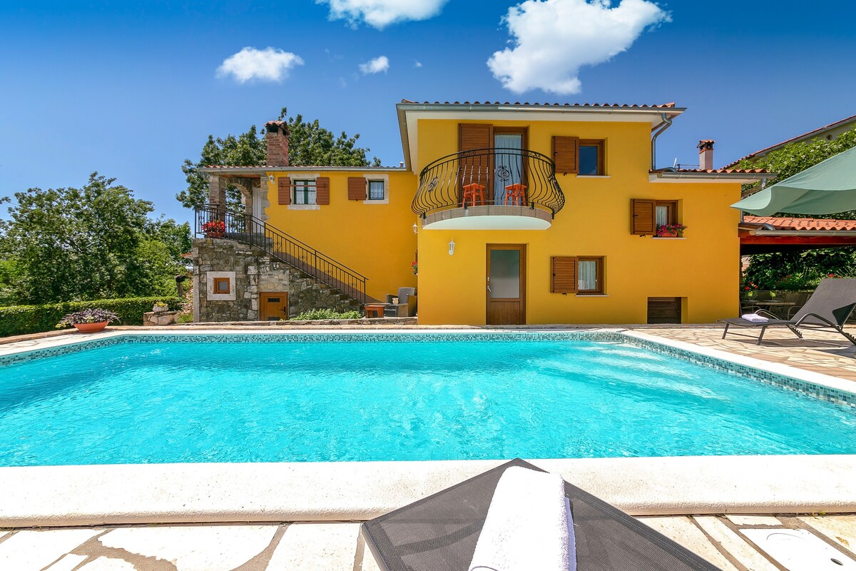 House Felicia with outdoor pool, located in a small and quiet place Čepić near Kršan, surrounded by only two neighboring houses, green meadows and vineyards. This house is ideal for those who want to relax in the countryside, with a beautiful view of the mountain Učka, or ride a bike and explore the surroundings in this way. The yard of the house is rich in children's content but with enough space for playing and running.