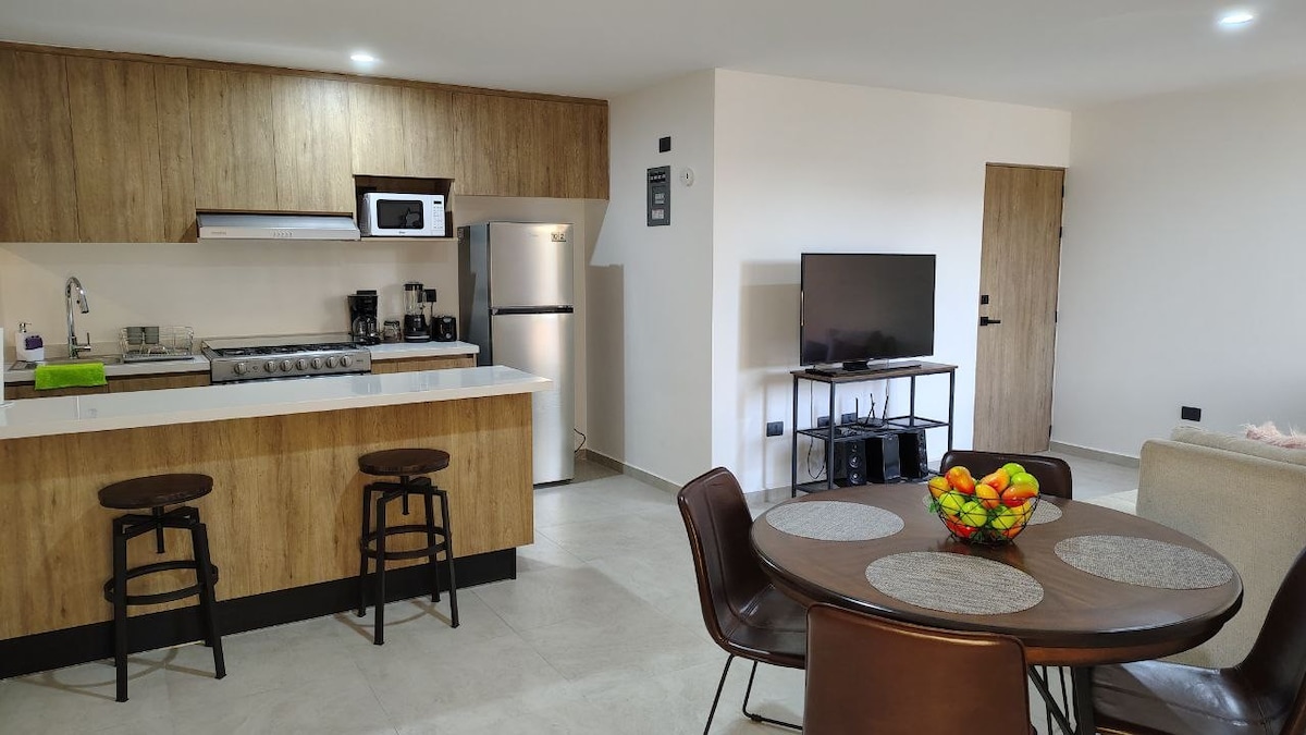 Tá an t-árasán úrnua seo, atá suite i gcroílár Juriquilla, 160 m2 ar mhéid, agus cuireann sé eispéireas uathúil ar fáil, ag dul thar fóir le saoráidí agus siamsaíocht. Má tá tú ag lorg ardchaighdeáin, ná bí ag cuardach níos faide agus tar chuig an árasán is nua-aimseartha agus is sómasaí in Queretaro le haghaidh fanacht nach ndéanfar dearmad air choíche Ag siúl ó Starbucks, Walmart, Beáir agus bialanna den scoth amhail Sonora Grill & Hunger, tá gach rud ag an árasán seo, leapacha compordacha, balcóin, teilifíseáin OLED 4K agus Pictiúrlann Bhaile 100" ó do leaba