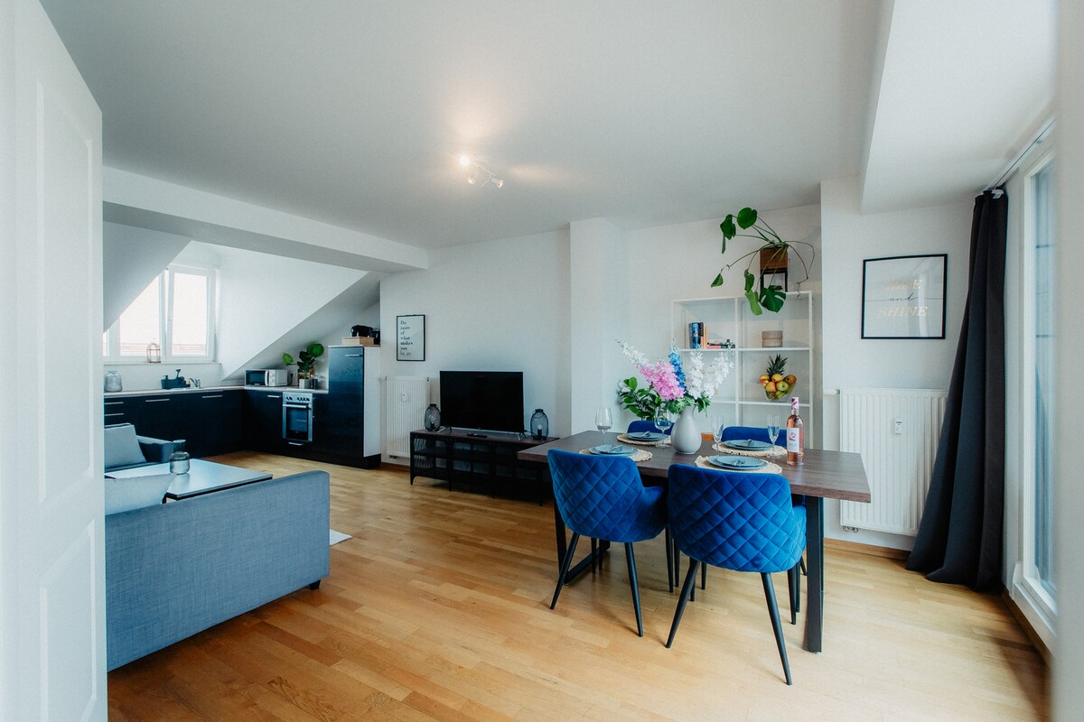 ZKB álainn, 34 méadar cearnach, seomra suí +cistin, balcóin, seomra folctha. Ardaitheoir. Leaba 1.60 m ar leithead, tolg ar féidir é a tharraingt amach a chodladh freisin (ach ansin éiríonn sé daingean). Ideal do dhuine amháin nó beirt (suas le 4 dhuine ar a mhéad). Is leor spás stórála le fanacht fiú 4 seachtaine, tá gach rud a theastaíonn uait sa chistin, cithfholcadán fairsing, triomadóir niteoirí. Suíomh: Gastro: 1 min, ionad 5 min.stáisiún traenach, 10 min., staidiam 8 min.tram, 150 méadar. Páirceanna/Auwald 5 nóiméad ar rothar.